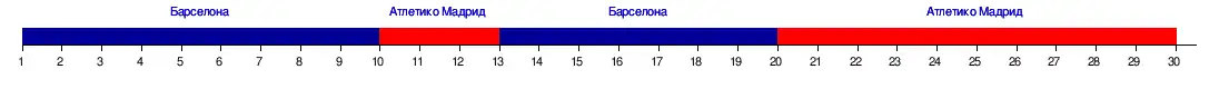 | Барселона | 1 | 1 | 1 | 1 | 1 | 1 | 1 | 1 | 1 | 2 | 2 | 2 | 1 | 1 | 1 | 1 | 1 | 1 | 1 | 2 | 2 | 2 | 2 | 2 | 2 | 2 | 2 | 2 | 2 | 2 |
