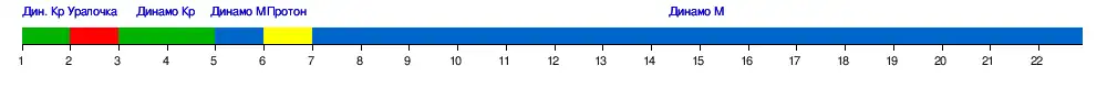 Примечание. При равенстве количества побед и соотношения партий «Протон» находится выше «Енисея» благодаря лучшему соотношению выигранных и проигранных очков: у «Протона» 1543:1515=1,018; у «Енисея» 1569:1591=0,986.