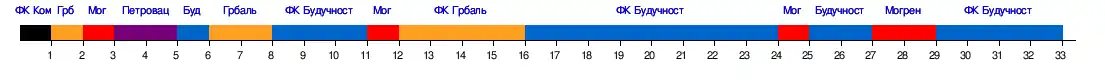 | 2 | ФК Будучност (Ч) | 33 | 21 | 7 | 5 | 72 − 34 | +38 | 70 | Первый квалификационный раунд Лиги Европы |
