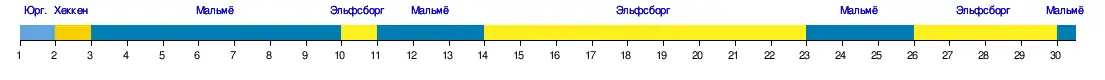 | Мальмё | 5 | 2 | 1 | 1 | 1 | 1 | 1 | 1 | 1 | 2 | 1 | 1 | 1 | 2 | 3 | 3 | 3 | 2 | 3 | 3 | 2 | 2 | 1 | 1 | 1 | 2 | 2 | 2 | 2 | 1 |