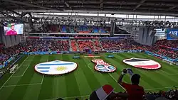 | Разминка сборной команды Уругвая | Представление команд перед матчем | Подача углового удара в исполнении Карлоса Санчеса | Уругвайские болельщики на «Екатеринбург Арене» |