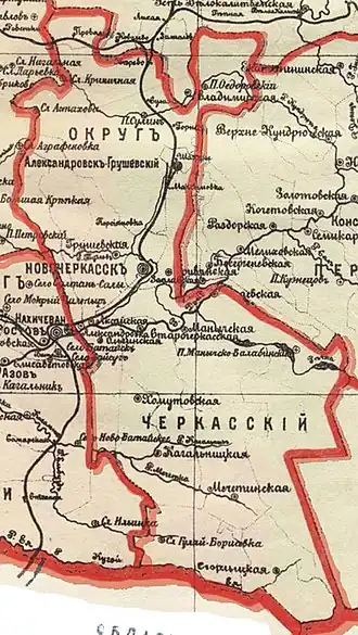 В 1871 году Черкаский округ по административному управлению разделялся на 15 казачьих станиц и 4 крестьянские волости[3]: