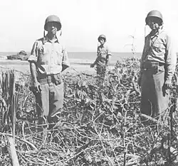 Оригинальный текст (англ.)A jeep wheeled up towing a 37-mm anti-tank gun and Captain Andrews of D Company put a crew of men to setting the thing up to fire into the palm grove. Then I heard it—just before the gun began firing—a weird wailing and moaning, almost a religious chant...coming from the trapped Japanese soldiers. Then the gun fired canister shot into them, again and again, and after a while the chanting stopped and the firing stopped and for a moment it was all-quiet. Some of us went among the palm trees to look, and there, row on row, were the torn and shattered bodies of perhaps 300 young Japanese soldiers. There were no survivors.[29]