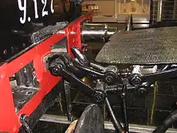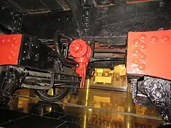 — привод ручного тормоза был сделан наклонным и прикреплён к водяному баку, поскольку вследствие применения на паровозе будки с наружными дверями (вместо открытых проёмов) и наклонными лестницами не удалось установить вертикальную колонку ручного тормоза.