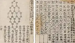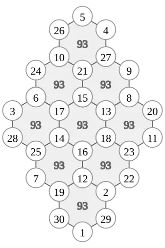 На иллюстрации приведено решение задачи из книги Чхве Сок Чона «Гусуряк», в которой содержится много интересных математических открытий. Сумма шести чисел в вершинах каждого шестиугольника равна 93. В зависимости от расположения чисел от 1 до 30 по узлам решетки магическая сумма варьируется от 77 до 109.