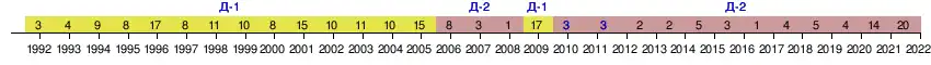 | 1991 | Вторая низшая лига, 10 зона | 1 из 18 | 34 | 21 | 10 | 3 | 46—12 | 52 | 1/32 | |