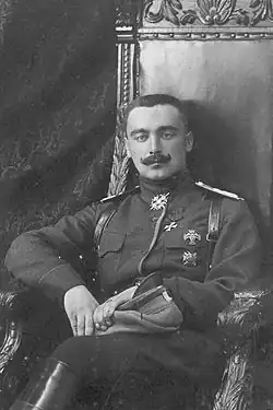 В Первую мировую войну вступил со своим полком. Был удостоен ордена Святого Георгия 4-й степени
