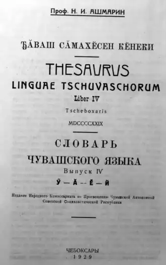 - ↑ Исследователи чувашского языка : Ашмарин Николай Иванович. nasledie.nbchr.ru. Дата обращения: 22 ноября 2021. Архивировано 14 марта 2022 года.