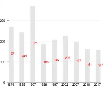 Число жителей по семейным спискам 1879 г.: 127 м. п., 144 ж. п.; по приходским сведениям 1879 г.: 129 м. п., 143 ж. п.;