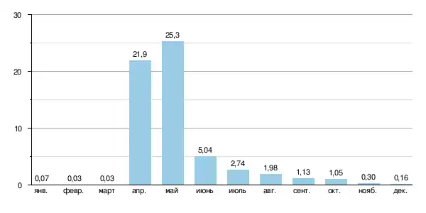 • Максимальный расход воды приходится на апрель-май и соответствует периоду таяния снежного покрова.