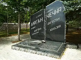 Мемориал представляет собой треснувшую чёрную гранитную стелу, на которой выбиты названия «горячих точек»: крупно «Афганистан», «Чечня» и помельче «Ангола», «Дагестан», «Египет», «Сирия», «Абхазия» и др.