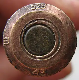 Для пулемёта ШКАС на базе штатного винтовочного патрона 7,62×54 мм R[8] разработаны патроны калибра 7,62 мм с трассирующими (Т-30 и позже Т-46), зажигательными (Аз, ЗП и ПЗ), бронебойными (Б-30) и комбинированного действия бронебойно-зажигательными (Б-32)[24], бронебойно-зажигательно-трассирующими (БЗТ)[25] пулями, способные воспламенять бронированные бензобаки[5][26]. В патронах ШКАС для предотвращения распатронирования (демонтажа)[к. 2] патрона при огромном темпе стрельбы от 30 до 50 выстрелов в секунду утолщены стенки гильзы, усилено крепление капсюля в гнезде, увеличено усилие извлечения пули. Для патронов с обыкновенными пулями Л и Д введён двойной кольцевой обжим пули в дульце гильзы, сама пуля посажена в гильзу глубже[8][27]. На донце гильзы патронов, предназначенных для пулемётов ШКАС, помимо стандартных обозначений, в конце 30-х годов ставилась буква «Ш». Капсюль таких патронов окрашивался в красный цвет. В остальном окраска была стандартной для соответствующих типов пуль. Боеприпасы, предназначенные для пехотного оружия, в пулемётах ШКАС применяться не могли из-за недостаточной надёжности. Боеприпасы к пулемёту ШКАС стали первым в мире случаем разработки и производства патронов специально для авиации[6][26][25][28].