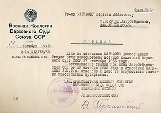 - ↑ Мемориальный сайт Аббас-Мирзы Шарифзаде. Документ № 55. (азерб.). abbasmirzasharifzade.info. Дата обращения: 17 октября 2014. Архивировано 27 октября 2014 года.