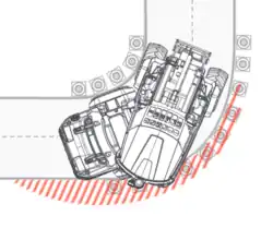 Таким образом, поворот мини-погрузчика осуществляется не углом установки колес, как это происходит у обычных колесных мини-погрузчиков, а изгибанием (переломом) надвое. Это дает возможность мини-погрузчику разворачиваться буквально «на пятачке», благодаря излому рамы достигаются малые радиусы поворотов, что особенно важно для техники, предназначенной для работы в стесненных условиях.