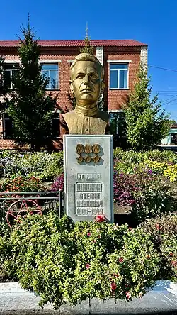 - Бюст установлен на Аллее Героев центральной площади по улице Октябрьской в городе Пласт Челябинской области