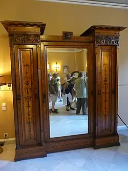 Кроме основного отделения в платяных шкафах устраивают полки, ящики и антресоли. Над штангой может размещаться полка для головных уборов, на дверцах устанавливают зеркала, а также перекладины и полки для хранения галстуков, поясов и других мелких вещей.