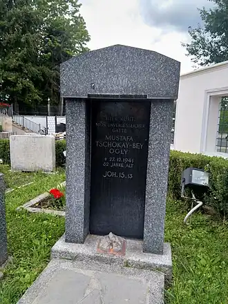 Мустафа Шокай похоронен на турецком мусульманском кладбище (Османидов) в Берлине. На надгробном памятнике чуть ниже даты кончины по воле супруги М. Шокая, Марии Яковлевны, проставлены три латинские буквы и четыре цифры: JOH.15.13. Они указывают на тринадцатый стих пятнадцатой главы Евангелия от Иоанна, который гласит:
