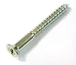 Шуру́п (от нем. Schraube — «винт, болт» < лат. scrobis — «яма, влагалище»[3]) — крепёжное изделие в форме стержня с наружной специальной резьбой, резьбовым коническим концом и головкой на другом конце, предназначенное для соединения с мягкими материалами (деревом, пластмассой) путём образования резьбы в отверстии соединяемого изделия. Специальная резьба имеет треугольный заострённый профиль и бо́льшую ширину впадины по сравнению с шириной зуба.[4]