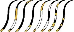 | (англ. ripple coat) — рифлёная шерсть | — нормальный волос — рифлёный волос | Проявляется в виде полосатого рисунка у щенков некоторых пород (бладхаунд, веймаранер) и обычно исчезает в течение недели. У некоторых особей рифлёность волоса сохраняется[26]. | |
