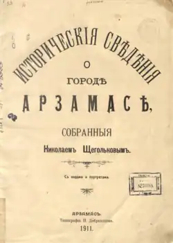 - Исторические сведения о городе Арзамасе, собранные Николаем Щегольковым. С видами и портретами. — Арзамас: Типография Н. Доброхотова, 1911. — 282 с.