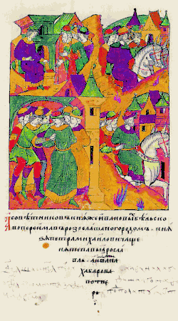 «Паки убиен княжа Пётр, — читаем мы в „Истории великого князя Московского“, — глаголемый Щенятев, внук княжати Литовского Патрикия: муж зело благородный был и богатый, и, оставя всё богатство и многое стяжание, мнишествовати был произволил, и нестяжательное, христоподражательное жительство возлюбил; но и тамо мучитель мучити его повеле, на железной сковороде огнём разженной жещи и за ногти иглы бити. И в сицевых муках скончался».