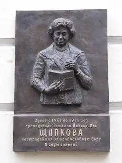 - ↑ Святейший Патриарх Кирилл принял участие в церемонии открытия в Смоленске мемориальной доски памяти Т. Н. Щипковой, пострадавшей за веру в позднесоветские годы Архивная копия от 19 сентября 2016 на Wayback Machine. Патриархия.ру, 15.07.2012.
