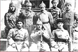 В первом ряду: С. М. Будённый, К. Е. Ворошилов, Е. А. Щаденко, стоят слева направо: Лакотош, Г. Ф. Беляков, Н. К. Щёлоков, С. М. Орловский, Г. К. Сиденко. Ростов-на-Дону, 1920 г.