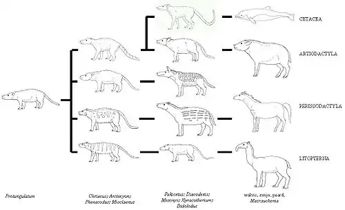 Традиционные взгляды на эволюцию китообразных состояли в том, что их ближайшими родственниками и, вероятно, предками являлись мезонихии — вымерший отряд хищных копытных, которые напоминали волков с копытцами вместо когтей и были сестринской группой парнокопытных. Эти животные имели зубы необычной конической формы, похожие на зубы китообразных. В частности из-за этого учёные долгое время считали, что китообразные произошли от некой предковой мезонихии.