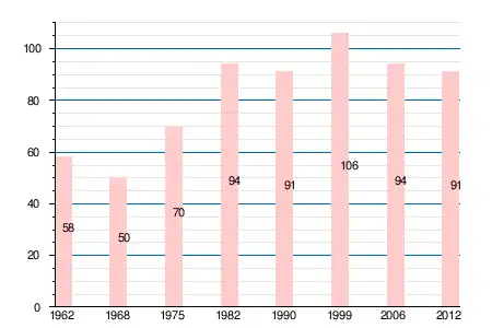 | 1962 | 1968 | 1975 | 1982 | 1990 | 1999 | 2006 | 2008 | 2011 | 2012 |