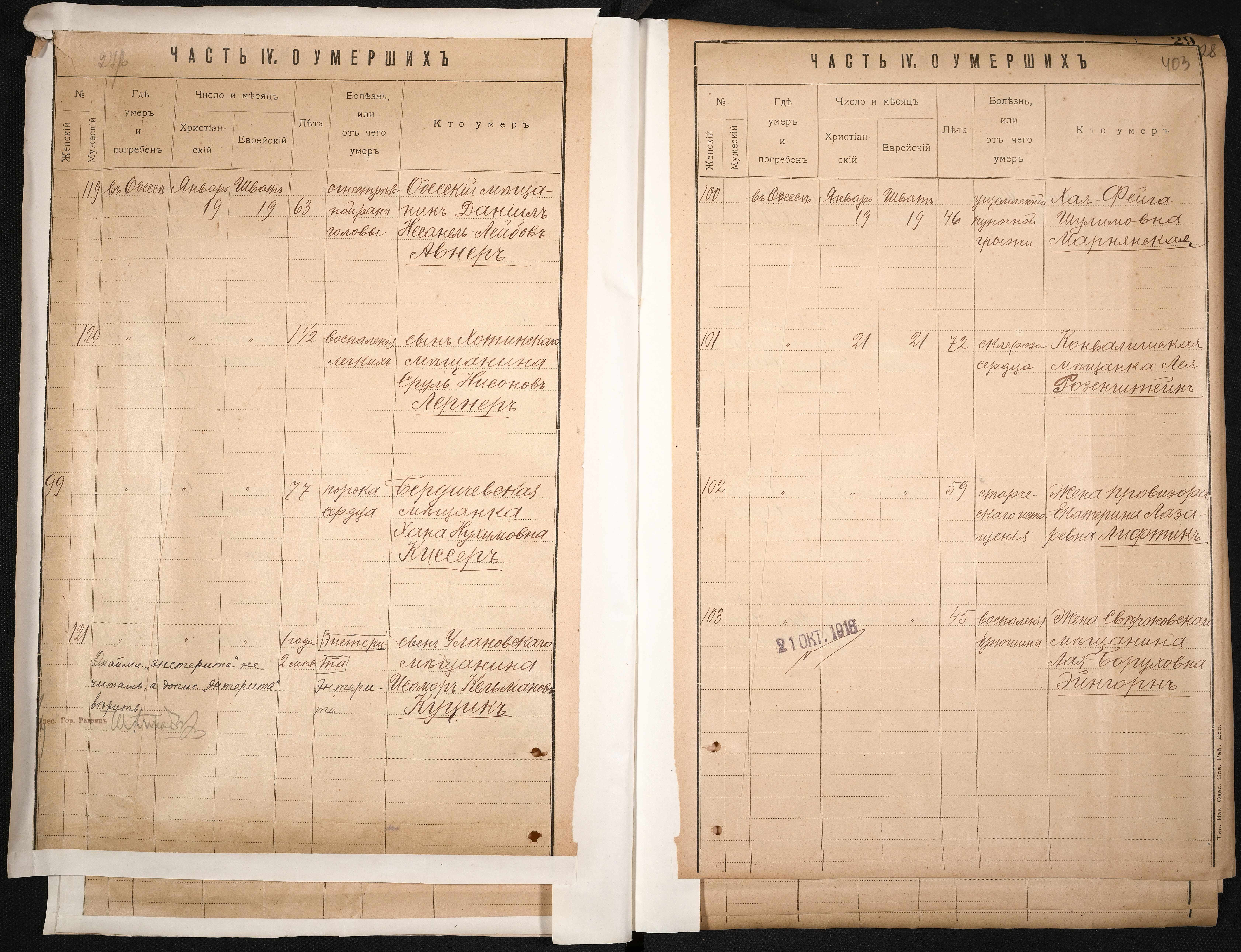 - ↑ Запись о смерти жены свержовского мещанина Лаи Боруховны Эйнгорн 21 января 1918 года в канцелярии одесского городского раввина