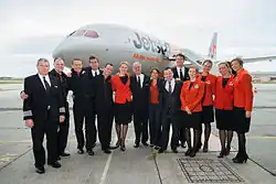 - Бортпроводник (англ. Flight attendant) — это член экипажа, отвечающий за безопасность пассажиров[17]. Исторически сложилось так, что в раннюю эру коммерческой авиации на эту должность работали молодые «юнги», которые помогали пассажирам. Бортпроводников заменили медсёстры-женщины, которых первоначально называли «стюардессами». Требование о медицинском образовании для должности бортпроводника позже было снято[17].