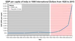 В период британского правления в Индии развивались ориентированное на экспортные культуры сельское хозяйство и транспортная инфраструктура, развитие других отраслей целенаправленно сдерживалось. Доля страны в мировой экономике сократилась с 22,6 % в 1700 году до 3,8 % в 1952 году. Став независимой в 1947 году, Индия была беднейшей страной мира по доходам на душу населения[7][8].