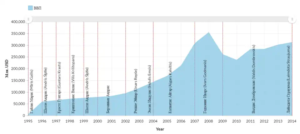 Экономика Латвии пережила один из самых высоких темпов роста ВВП (валовой внутренний продукт) в Европе (см. Балтийские тигры): так, с 2005 по 2007 гг. среднегодовые темпы роста ВВП превысили 10 %, поскольку крупные притоки иностранного капитала стимулировали существенный рост потребительских расходов. Глобальный финансовый кризис 2007—2008 годов привел к экономическому кризису в Латвии и сокращению ВВП в 2009 году примерно на 18 %, что является одним из крупнейших спадов в мире в течение года[21]. В то же время, с середины 2010 года, ВВП Латвии снова начал расти, главным образом благодаря растущей роли экспорта.