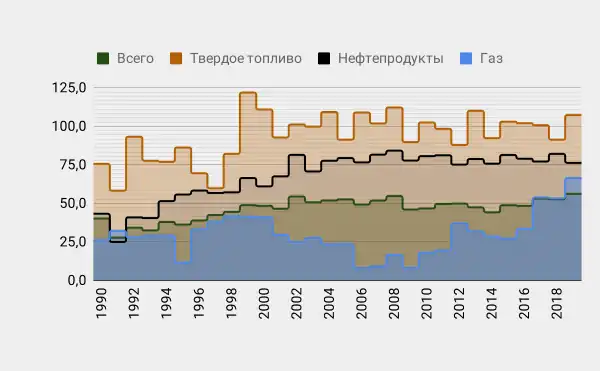 Специфика топливно-энергетического баланса страны за 2019 год иллюстрируется данными нижеследующей таблицы[9]. Производство первичной энергии около 44,0 млн тонн toe (в нефтяном эквиваленте), в том числе: природный газ - 14,7 млн toe или 33,5%; сырая нефть и нефтепродукты - 7,1 млн toe или 16,1%; возобновляемые источники и биотопливо - 22,1 млн toe или 50,2% и невозобновляемые отходы около 0,1 млн toe или 0,3%/