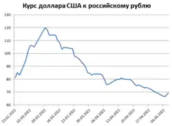 В конце июня доллар и евро на MOEX опустились до минимальных за 7 лет значений — 51,2 и 53,9 рубля, соответственно, 30 июня 2022 года. Но уже спустя неделю рубль резко потерял в стоимости около 20 % на фоне сокращения поставок газа в Европу и выхода трейдеров из рискованных активов (коим стал рубль)[18]. Несколько месяцев рубль был стабилен, а в декабре вновь начал падать под влиянием вступившего в силу (с 5 декабря 2022 года) потолка цен на нефть, согласованного (с февраля 2023) потолка цен на газ и принятого девятого пакета санкций[19][20]. ЦБ РФ исчерпал механизмы влияния на курс иностранной валюты, и на фоне сокращения экспортных доходов при нормализации импорта в 2023 год рубль вошёл с перспективой девальвации под весом санкций[17].