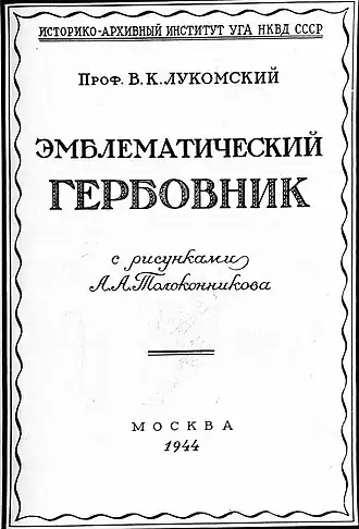 - Лукомский В. К. Эмблематический гербовник с рисунками А. А. Толоконникова. Историко-Архивный институт УГА НКВД СССР. — М., 1944.
