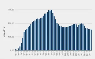 Украина. Производство электроэнергии-брутто, 1940—2019 гг., млрд. кВт∙ч. По данным ЦСУ СССР: 1940—1989 гг. и Держстата України: 1990—2019 гг.