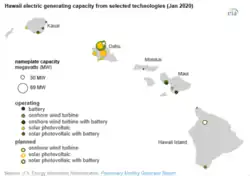 95% населения на Гавайях обеспечивается поставщиком Hawaiian Electric Industries. По состоянию на 2018 г. общая его мощность составляла 1727 МВт.[13] Каждый остров генерирует электроэнергию самостоятельно.[14]