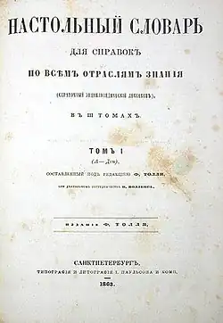 Среди других русских энциклопедий XIX века заслуживает внимания трёхтомный «Настольный словарь для справок по всем отраслям знаний» (Санкт-Петербург, 1863—1864) под редакцией Ф. Г. Толля.