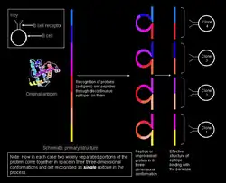 Эпитоп на поверхности белка-антигена может складываться из аминокислотных остатков, которые расположены далеко друг от друга в первичной структуре, но сближены в третичной