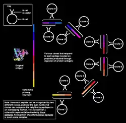 Большинство эпитопов, распознаваемых антителами или B-клетками, представляют собой трёхмерные структуры на поверхности молекул антигенов, которые точно совпадают по форме и пространственному расположению электрических зарядов с соответствующими паратопами антител. Исключение составляют линейные эпитопы, которые определяются характерной последовательностью аминокислот (первичной структурой), а не пространственной организацией. Протяжённость эпитопа, который способен распознать B-лимфоцит, может достигать 22 аминокислотных остатков.