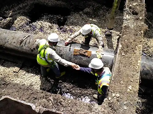 Керченский мост унаследовал технологии антикоррозийной защиты от эпоксидных покрытий нефтепроводов США. На снимке рабочие в 2010 году убеждаются в отсутствии повреждений эпоксидного покрытия, созданного корпорацией 3М в 1957 году (более 60 лет тому назад) для нефтепровода Enbridge Pipeline. - Далее на трубу наносится двухслойное порошковое покрытие[13] из эпоксидных смол[2][14]. Порошок расплавляется при температуре 270 °C и образует полимерные плёнки.