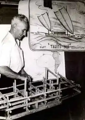 В 1956 году Эрик де Бишоп принялся за строительство своего нового судна — бамбукового плота. Он собирался проплыть на нём от острова Таити до побережья Южной Америки, спустившись до 40° ю. ш. Таким образом Эрик хотел опровергнуть теорию Тура Хейердала о заселении Полинезии с запада и доказать, что между народами существовал культурный обмен, но именно полинезийцы достигали берегов Южной Америки, а не наоборот. Вскоре определился экипаж плота. В него вошли: друг Эрика, Фрэнсис Коуэн, молодой француз Мишель Брэн (Мишель в это время готовился к свадьбе, и Эрик боялся, что он изменит своё решение, но невеста уговорила его участвовать). Также в команду вошли брат Мишеля Ален и чилиец Хуанито. В Папеэте у экспедиции был свой связист, Ролан д'Ассинье (ФО-8-АД)), раздражавший путешественников перекличками и неверными прогнозами. Плот был назван «Таити-Нуи» (великий остров Таити). Отплытие состоялось 8 ноября 1956 года. Местные жители подарили путешественникам кур, трёх котят-талисманов и свинью. Плавание началось удачно, только перед островом Пасхи пришлось сделать крюк. Вскоре ситуация изменилась: 9 мая 1957 года разразился очень сильный шторм. Позднее выяснилось, что шторм подобной силы бывает раз в 50 лет. Команде удалось справиться с бурей, но тяжёлой ценой: были сильно повреждены палуба и остов плота. «Таити-Нуи» мог продолжать плавание, но нового шторма он бы не выдержал. Эрик де Бишоп решил не рисковать и попросить отбуксировать плот до архипелага Хуан - Фернандес для ремонта. Отправленный радиосигнал о помощи был пойман радиолюбителем. На следующий день путешественники с удивлением узнали, что «Таити-Нуи» разбит и на борту трое раненых, кроме того, были даны неправильные координаты. Экипажу удалось связаться с другим радиолюбителем и уточнить координаты. Вскоре к плоту подошло чилийское судно «Бакедано» и взяло «Таити-Нуи» на буксир. Однако из-за высокой скорости, которую не мог выдержать плот, произошёл ряд осложнений. В результате он дважды врезался в корабль. После второго столкновения плот окончательно разбился, и было принято решение покинуть «Таити-Нуи»[11][12].