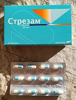 - ↑ Kruse HJ, Kuch H. Etifoxine: evaluation of its anticonvulsant profile in mice in comparison with sodium valproate, phenytoin and clobazam. Arzneimittelforschung. 1985;35(1):133-5.