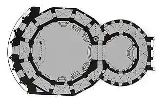 Изначально был построен готический храм, состоящий из основного 12-гранного здания и возвышающейся рядом колокольни. Уже в 1370 году церковь имела вполне завершенный вид. Но, начиная с XVIII века готические элементы сооружения стали постепенно заменять барочными, пока в 1744 году не случился сильнейший пожар, нанесший значительный урон всему комплексу монастыря. Только к 1790 году смогли восстановить храм в прежнем виде и со временем приступили к возведению боковых башен. Первой появилась северная башня (находится левее от центральной части храма) — в 1853 году. Спустя полвека построили и южную башню с часами[2].
