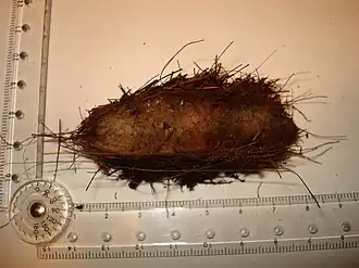 | Гусеница внутри хода, проделанного в стволе пальмы | Кокон, сплетённый гусеницей | Куколка внутри кокона |