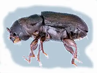 Взрослые насекомые длиной 2—4 мм, их тело короткое, цилиндрическое, коричневое или чёрное. Голова широкая и выдающаяся; у самцов на голове имеется явная выемка или лобовой желобок. У самок широкая, приподнятая кверху переднеспинка с поперечной бороздкой в передней половине. Брюшко округлённое. Молодые (незрелые) жуки по мере развития меняют свой цвет от желтовато-белого через красновато-коричневый до тёмно-коричневого или чёрного[4][2].