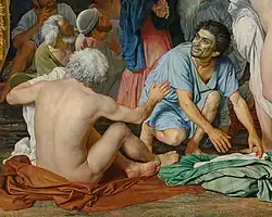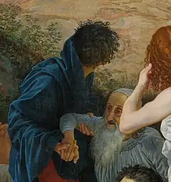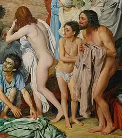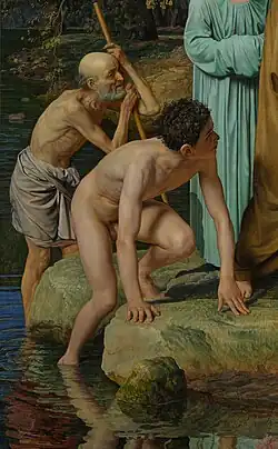 В толпе, выглядящей «общей массой» по отношению к Христу, выделяются отдельные группы и персонажи. Среди двенадцати фигур самого первого плана доминирующее положение занимает Иоанн Креститель[120]. За его спиной находится группа апостолов — Иоанн Богослов, «прислушивающийся» или «глухой» апостол (иногда отождествляемый с Петром), Андрей Первозванный и Нафанаил (или «сомневающийся» апостол)[2][121][122]. В самой левой части полотна изображены «выходящие из воды» — мальчик и опирающийся на палку старик, а в самой правой части — группа «дрожащих», представленная мальчиком и его отцом[121][123][124]. Левее «дрожащих» расположена фигура «смотрящего» — обнажённого юноши, повернувшегося спиной к зрителю[125]. В центре первого плана, между Иоанном Крестителем и «смотрящим» юношей, находятся богатый старик и его раб, чьи «сидящие фигуры как бы выпадают из массы стоящих людей»[126][127].