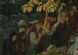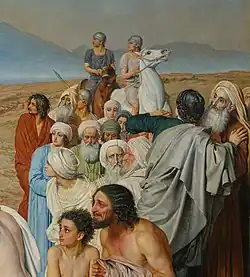 В правой части полотна, за «дрожащими», сверху вниз движется толпа, состоящая из фарисеев, римских всадников и других действующих лиц[128][129]. Самого левого персонажа из толпы, одетого в хламиду тёмно-кирпичного цвета, называют «ближайшим к Христу»[130]; некоторые исследователи связывают его с образом Николая Гоголя[131]. Ещё несколько персонажей изображены в центральной части полотна, за группой богатого старика и его раба. Среди них выделяются юноша и поднимающийся старик[132], а также сидящий странник с посохом[133], в образе которого некоторые авторы видят «духовный автопортрет» художника[134]. Под деревьями, находящимися в левой части холста, между головами апостолов можно увидеть «спрятанную» группу людей, среди которых есть и мужчины, и женщины. Как и все остальные, они тоже являются свидетелями происходящего действия[135].