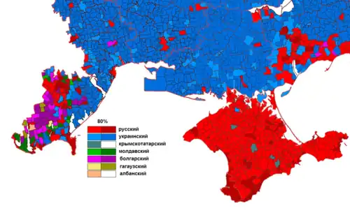 Языковая картина Крымского полуострова характеризуется преобладанием русскоязычия[30]. По данным переписи населения 2001 года среди родных языков кроме русского (77,0 %), заметно также присутствовали крымскотатарский (11,4 %) и украинский (10,1 %) языки[31]. В период нахождения в составе Украины, была характерна диспропорция между национальностью и языком употребления (родным языком), а также употреблением их в системе образования и делопроизводстве. В этот период была тенденция к постепенному оттеснению русского языка из официальной письменной сферы в республике при параллельном командно-административном внедрении украинского языка в систему образования и делопроизводства[16]. Хотя, согласно данным опроса, проведённого в 2004 году Киевским международным институтом социологии (КМИС), русский язык использует для общения абсолютное большинство — 97 % всего населения Крыма[32].